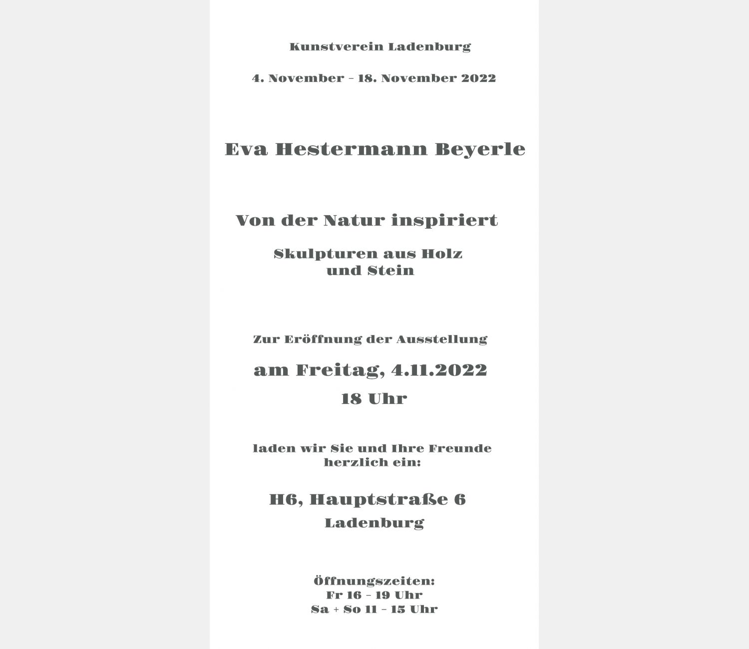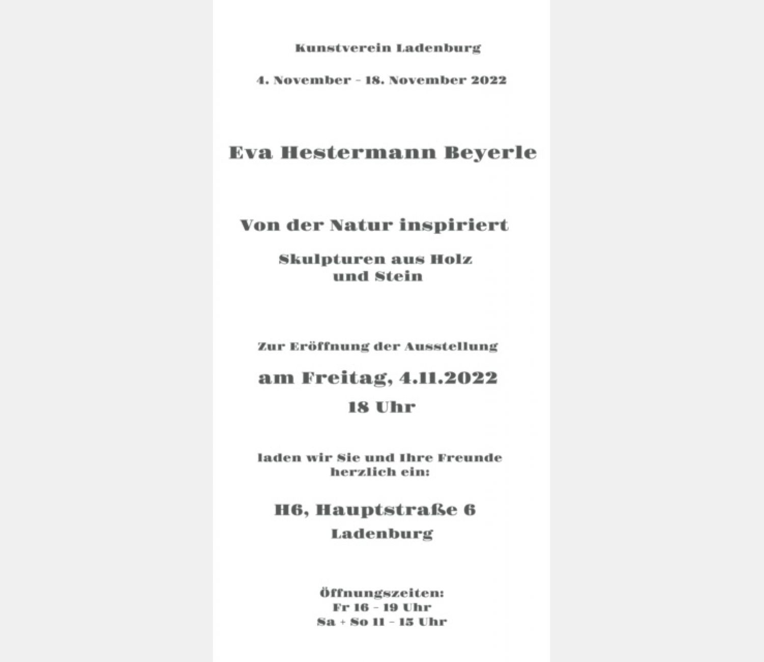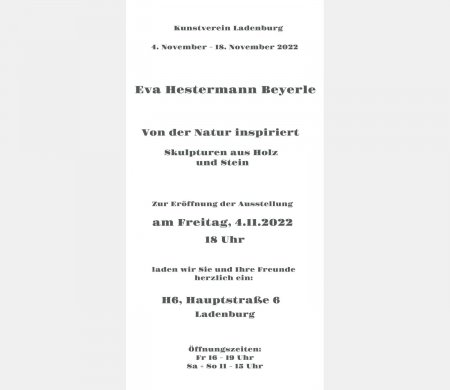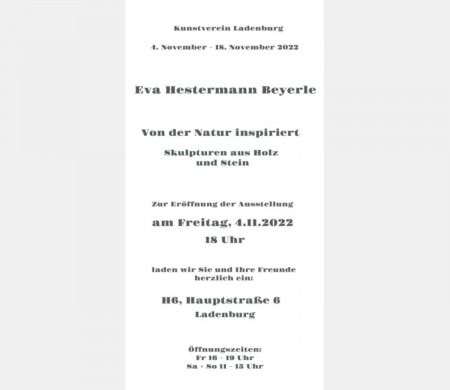 Am Freitag, den 4.November 2022, um 18 Uhr wurde die Ausstellung „Von der Natur inspiriert - Skulpturen aus Holz und Stein“ unseres Mitglieds der Künstlerin Eva Hestermann-Beyerle eröffnet. Es waren sehr viele Besucherinnen und Besucher gekommen, danke auch an die Landtagsabgeordnete Fadime Tuncer, dass sie diese Vernissage besucht hat.