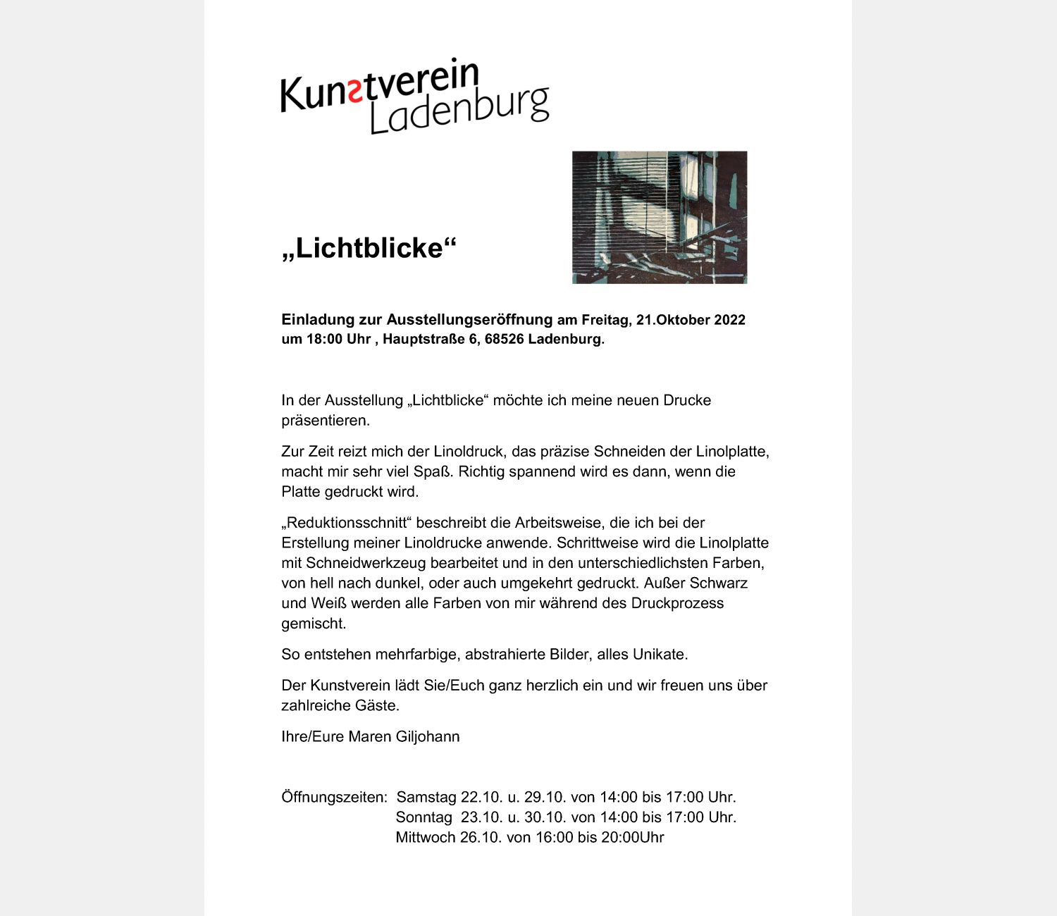 Der Kunstverein Ladenburg zeigte vom 17.10. bis 31.10.2022 im Raum H6 in der Hauptstr. 6 in Ladenburg die Ausstellung "Lichtblicke" von und mit unserem Mitglied Maren Giljohann. Es werden hauptsächlich Linolschnittarbeiten gezeigt