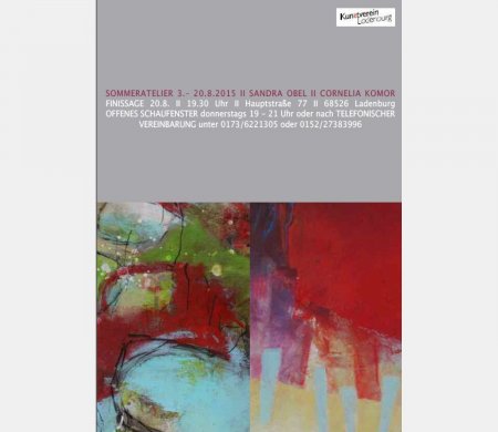Ab Montag, 3. August 2015, veranstalten die Künstlerinnen Cornelia Komor und Sandra Obel das "Sommeratelier" in Ladenburg, Hauptstr. 77 als offenes Schaufenster. Man kann das Entstehen von Werken der Malerei von der weißen Leinwand bis zum vollendeten Bild dabei verfolgen. Öffnungszeiten donnerstags von 19 bis 21 Uhr und nach tel. Vereinbarung. Die Finissage, zu der Sie herzlich eingeladen sind, ist am Donnerstag, 20.08.15, um 19:30 Uhr.